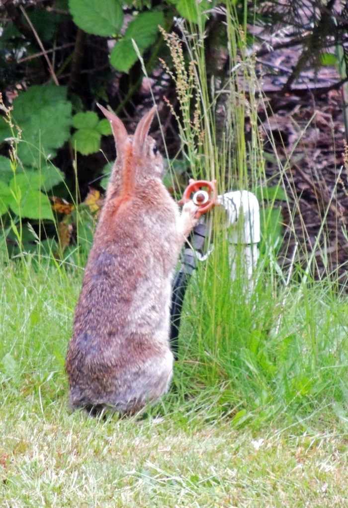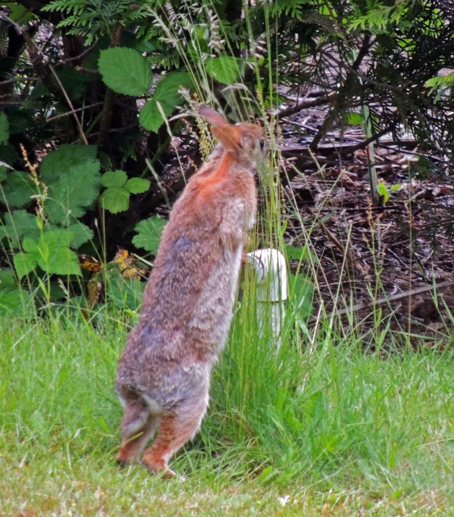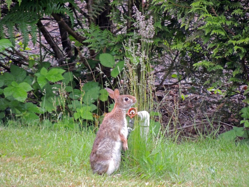 M-m-m! These tall grasses smell delicious!Oooh! Yummy! They are exquisite.I wonder if I should turn on the tap and give the grasses a drink of water to make them grow.This long stem is so good, and it gets better the closer I nibble it to the top. Hahaha! I could come to a seedy end!Uh-oh! Did I hear the backyard supervisors? Those dogs are F-A-S-T! At least, the little black one is. The other one is getting pretty old (thank goodness)!I’m just going to hide here for a minute. If I stand straight, I’ll look like part of the pipe. I think I’m slim enough, don’t you?On second thought, maybe I should crouch down and hold still. This is when I wish my ears weren’t so long.Just to be on the safe side I think I’ll skedaddle, quick like a bunny, until the coast is clear.