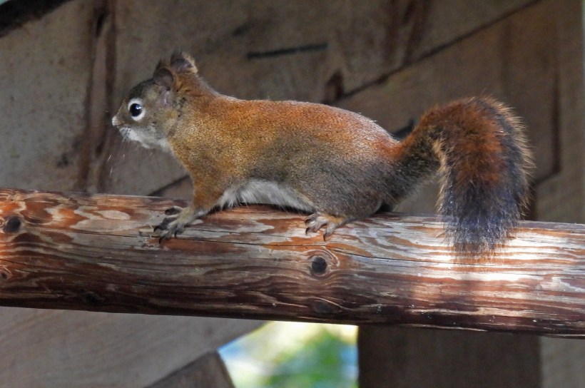 In spite of being pregnant, probably with triplets or quadruplets, Della still likes to explore the forest around the woodshed. She has a long pole that she runs out on. She checks for danger, and then launches herself to the nearest fir tree.