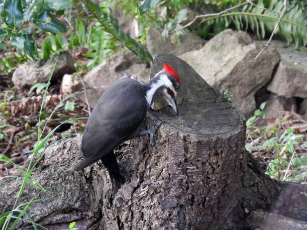 As the wood decays, all sorts of worms and bugs feed off it, and in turn they become food for some birds. This pileated woodpecker is chipping into the bark of the stump and must be finding something good to eat. See his tongue sticking out, slurping up the appetizers?