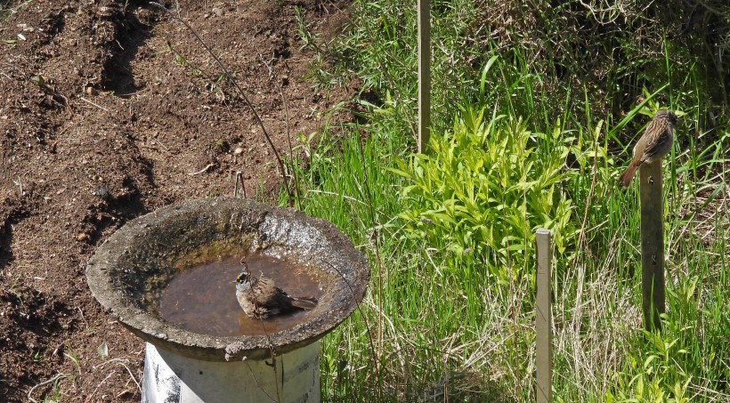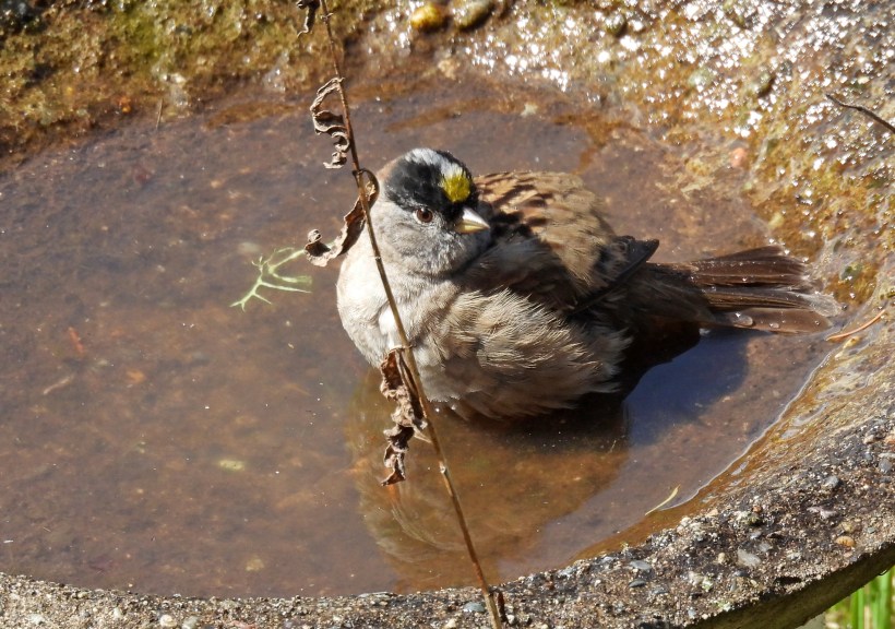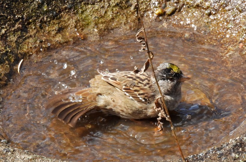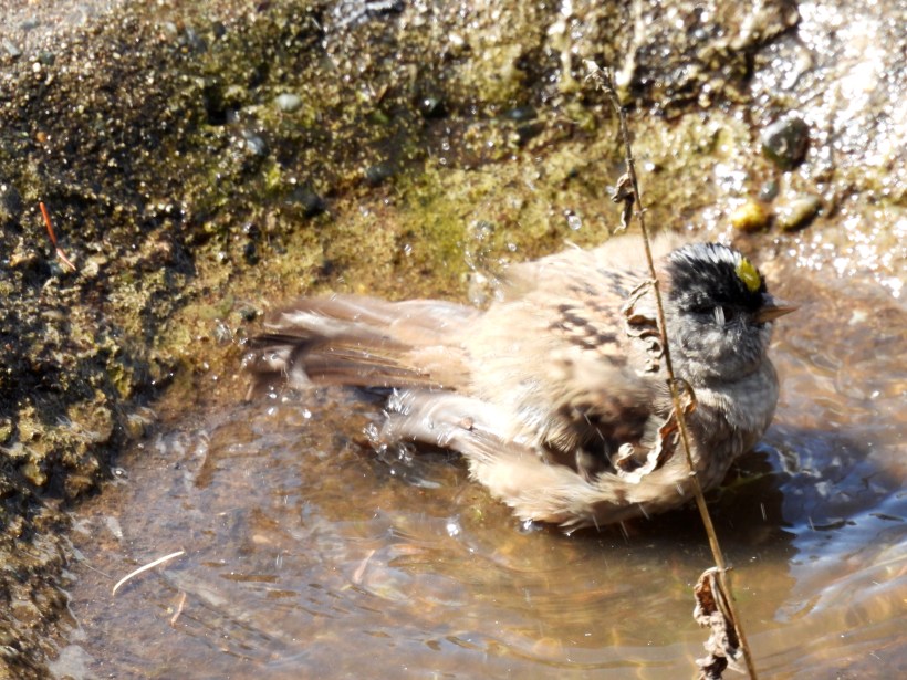 The sun came out today. It was a big deal. The golden-crowned sparrows decided that it was time for their spring bath.