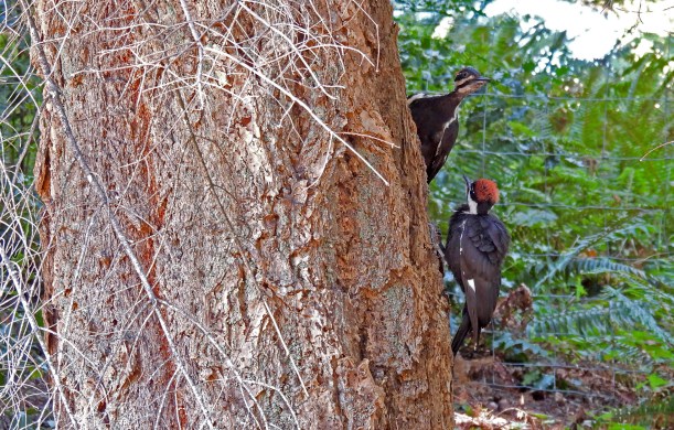 Pam is working hard, pecking open the bark to look for bugs. Junior is still afraid of giving herself a headache so she lets Mom do all the work.