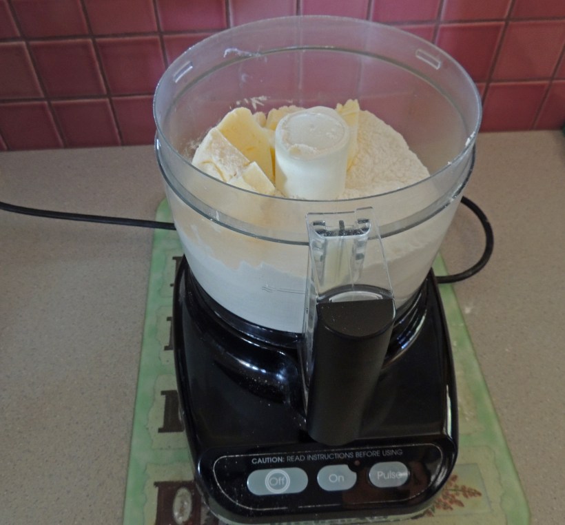 In a food processor, put two cups of flour, a cup of butter, a pinch of salt, and a quarter cup of sugar. Pulse it a few times to blend.