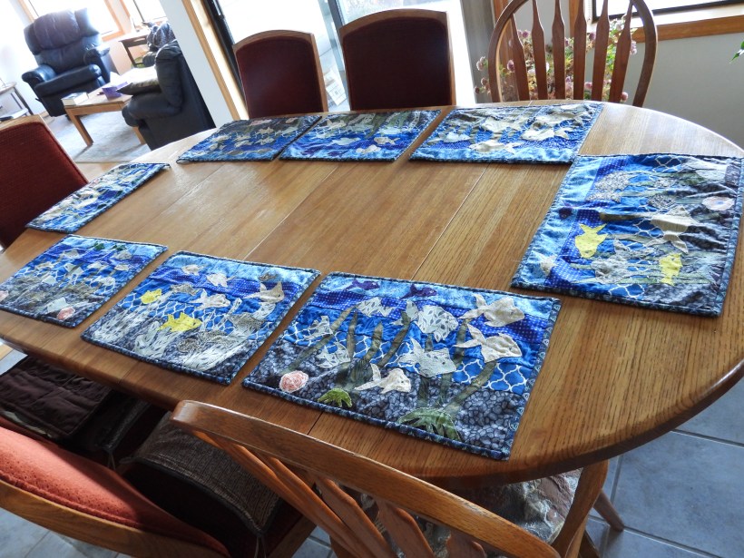 These are the fish placemats I started almost a year ago. By the time I got to the nearly finished stage, I had lost my enthusiasm to do much quilting in between the fish. You might be able to see where I did a tiny bit of quilting in the second to last placemat, but I soon decided that it was a waste of time and not really necessary.