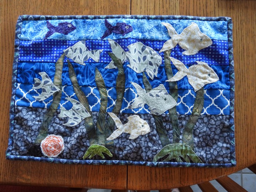 The back of the placemats is of the same material as the binding around the edges. When I get tired of looking at fish, I can flip the placemats over. This project has taken me so long that by the time I was putting the binding on, I didn’t much care if the corners weren’t exact or the edges a bit wobbly.