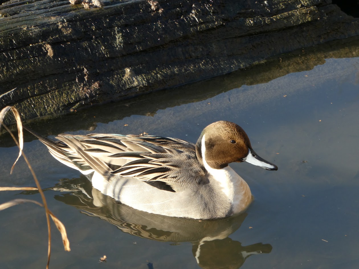 These photos are of the drake pintail. The hen (female) pintail has a similar shape, without the long pointy tail feathers, and with more muted colours (keeping her safer when nesting).
