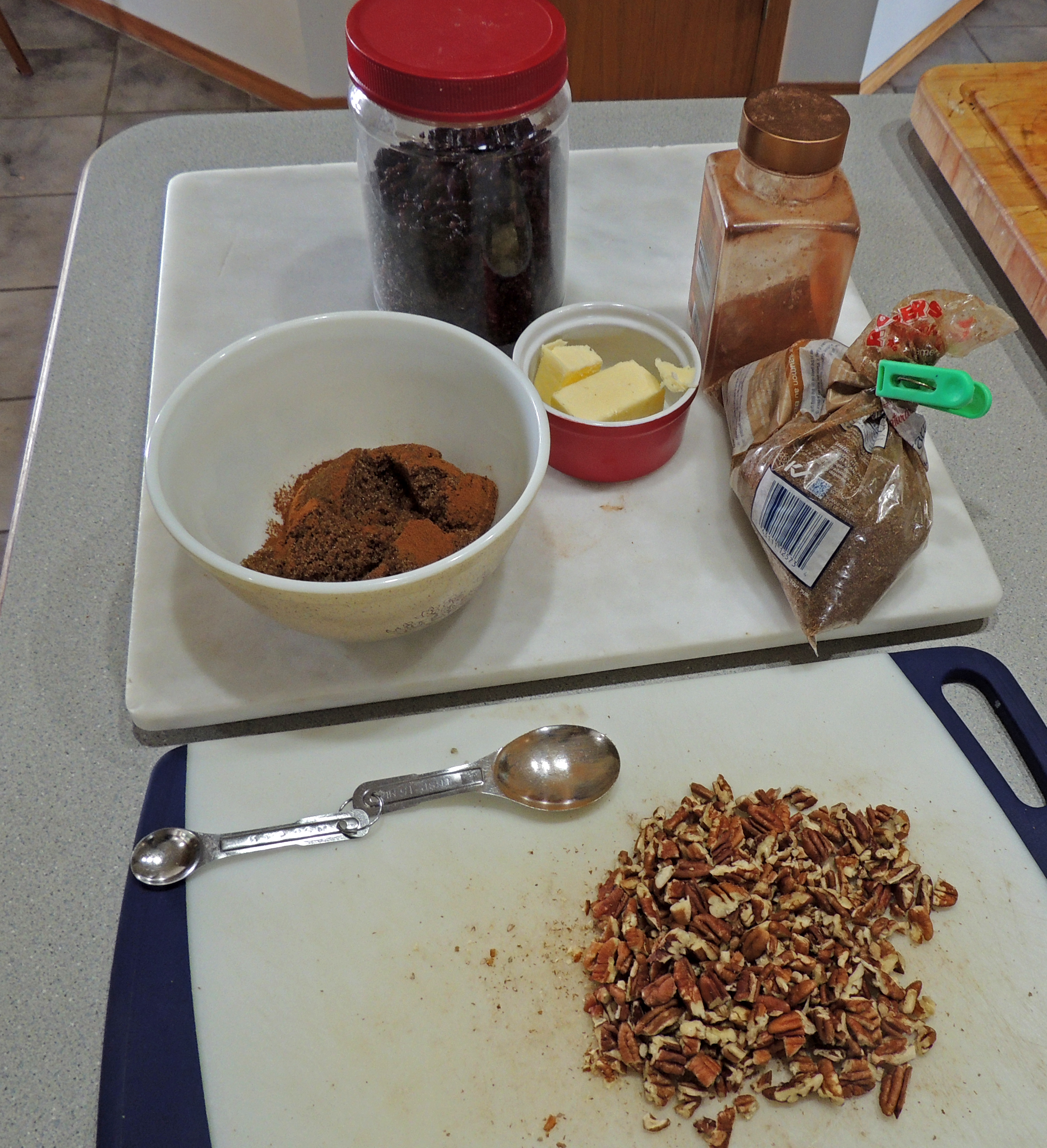 Cinnamon, butter, brown sugar, raisins (or currants), pecans (or walnuts).