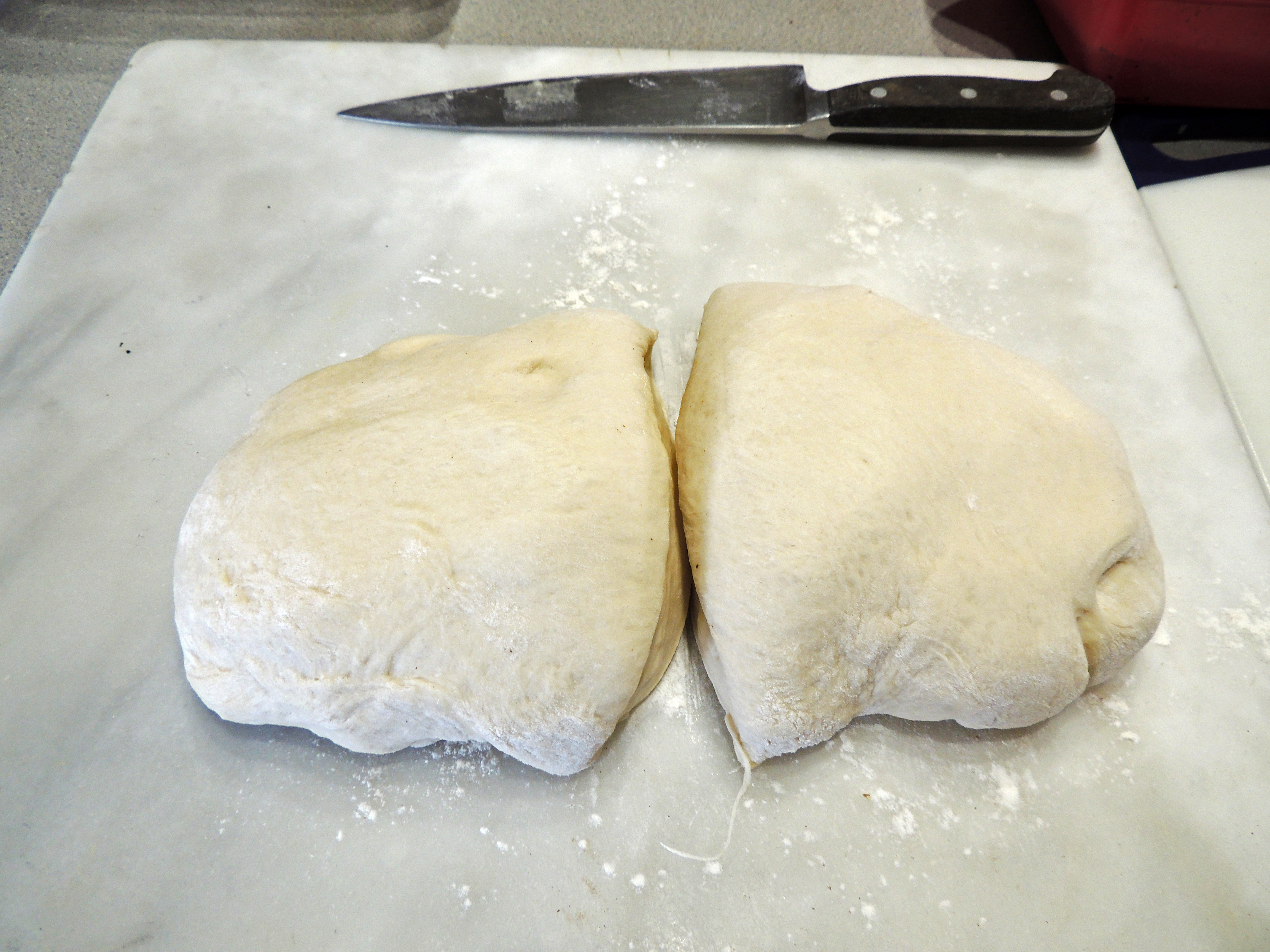 After letting the dough rise in a big bowl in a barely warm oven, cut it in half and roll out each half (one at a time).