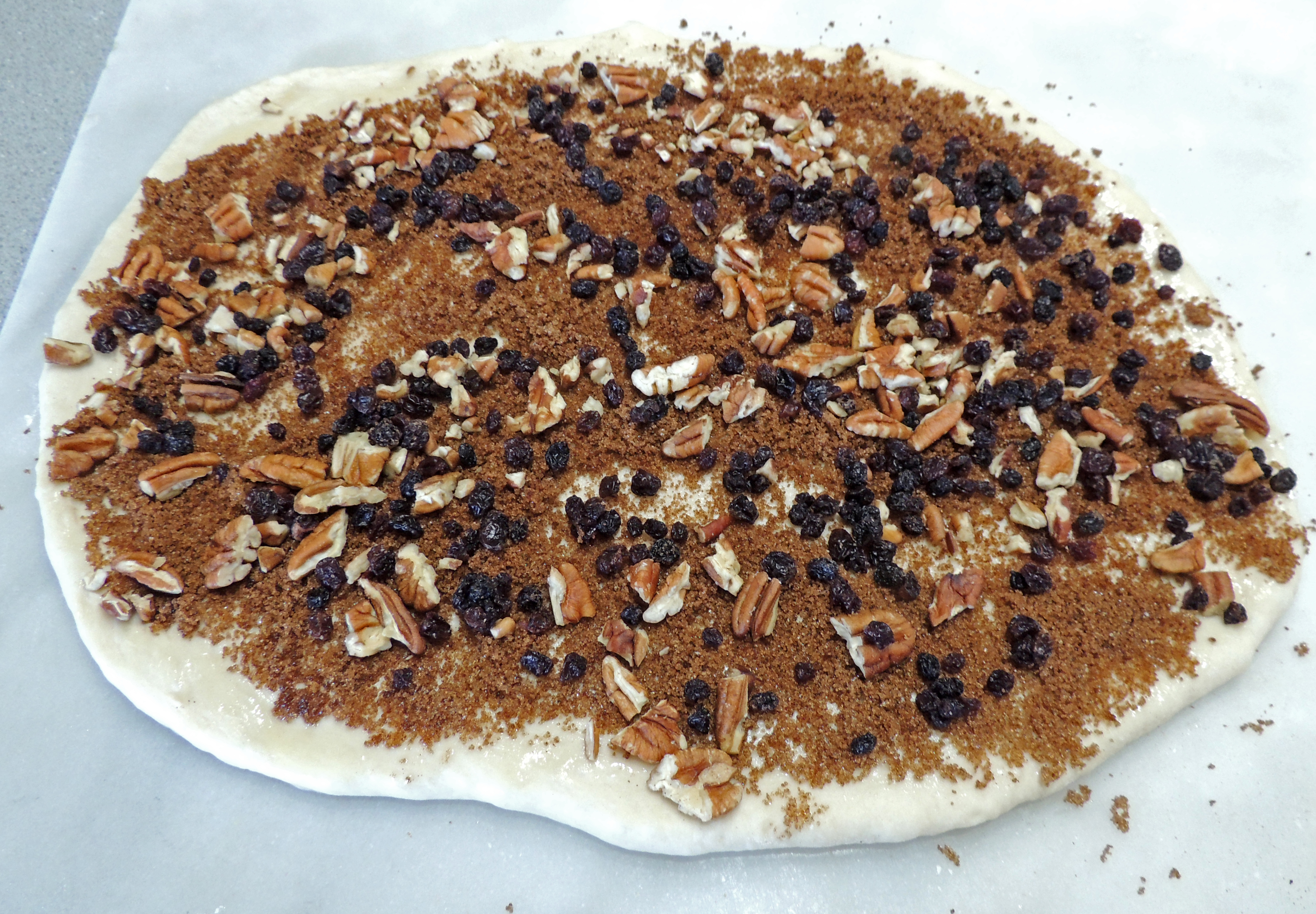 Sprinkle with brown sugar (maybe not as much as what is shown in this photo), cinnamon, currants, and pecans.