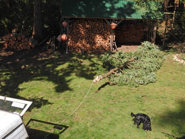 The Captain pulled the treetop off the woodshed roof with his old beater truck while the Admiral ran for the tape measure. Thirty feet snapped right off the top of a tree to the left of the woodshed.