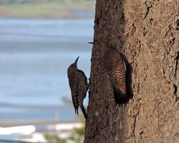 Okay, Junior, forget about pecking at houses. This is how we find the best bugs — on the trees. You hold on with your toes and hop around all sides of the tree. The tree doesn’t mind. It thinks we’re hugging it.