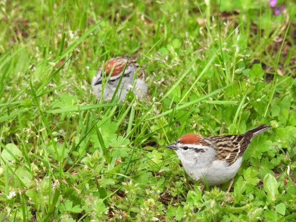 Little songbirds like these chipping sparrows will be targeted by hawks who sit silently in the nearby trees, waiting for an opportunity to swoop down and scoop up a little snack.