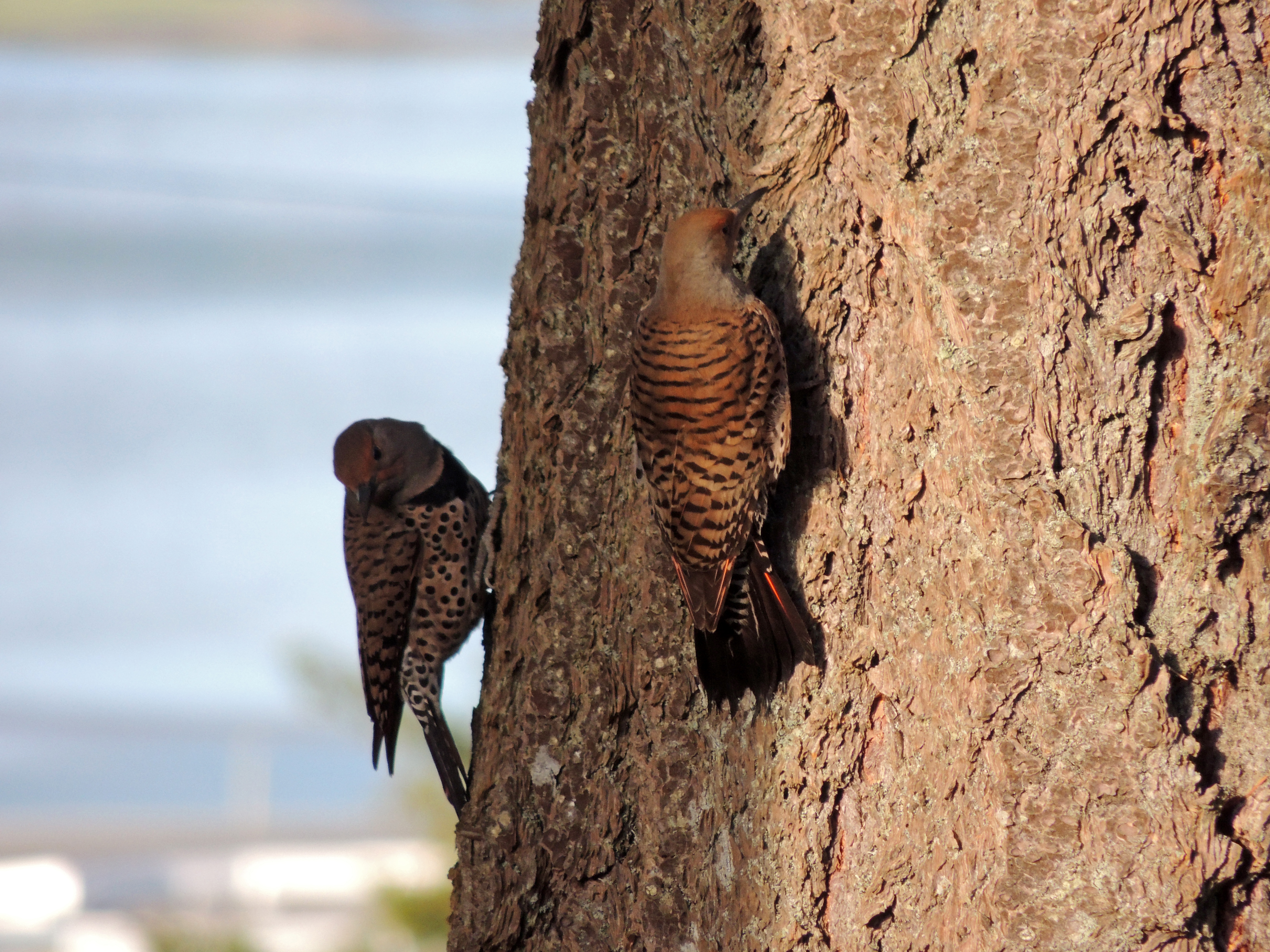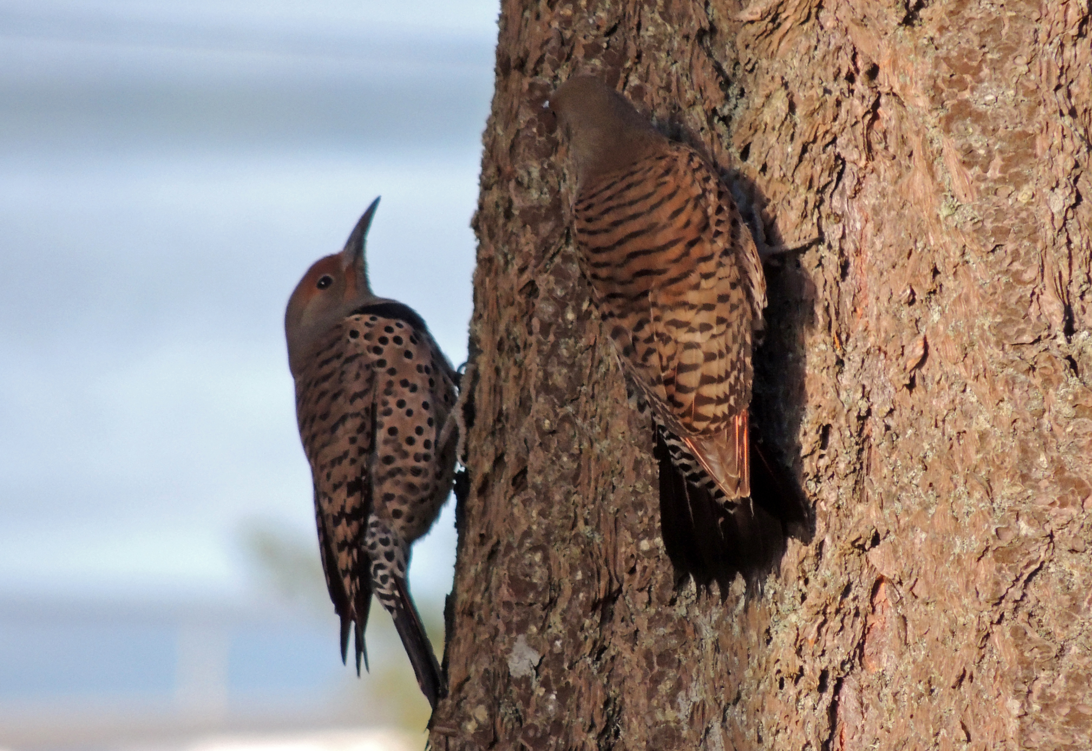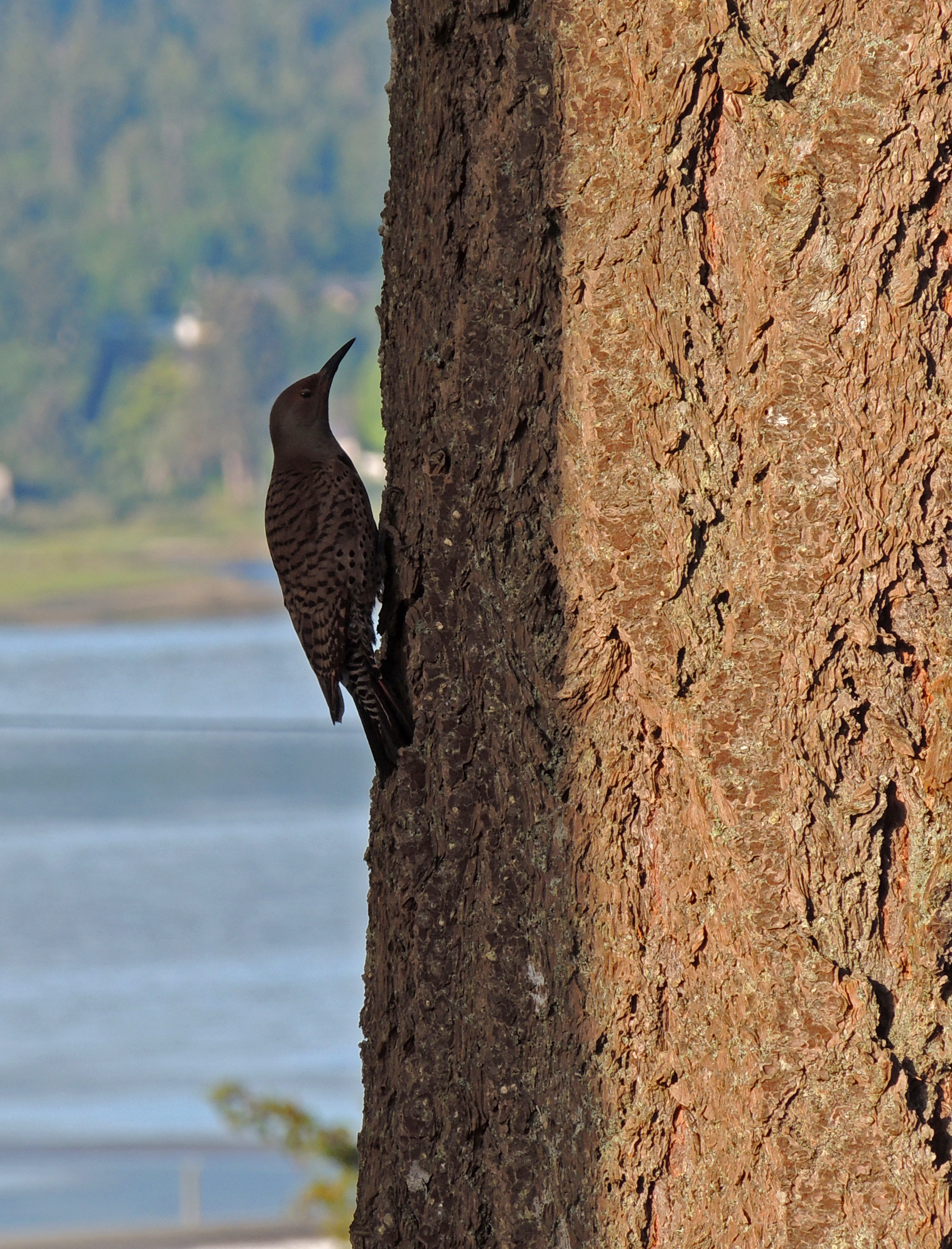 Okay, Junior, forget about pecking at houses. This is how we find the best bugs — on the trees. You hold on with your toes and hop around all sides of the tree. The tree doesn’t mind. It thinks we’re hugging it.