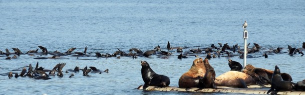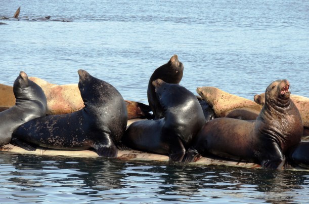 From these photos, I can’t tell which is which, or even whether there are both kinds of sea lions here. I do know that California sea lions, averaging about 220 lbs. (females) and about 700+ lbs. (males) are much smaller than the Steller’s sea lions which can weigh on average 580 lbs. (females) and almost 1200 lbs. (males). The males quite often weigh much more than that.