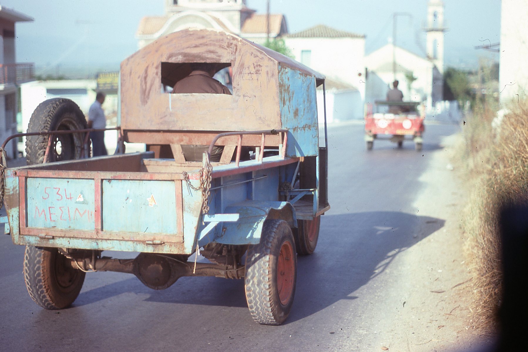 I don’t know what brand of vehicle this is, but I wonder if it’s something that was built in a backyard workshop. You can see that the vehicle up ahead is also a three-wheeler, but the blue one in the foreground looks like it has had some modifications.