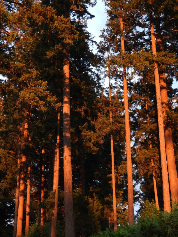 At a certain time of the evening, the last rays of the sun paint a golden glow on the tall firs. We call it “the nice light” when that happens. The morning light is similar, but the glow isn’t as warm as the evening light.