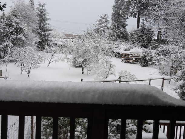The hummingbirds … where do they sleep on nights like this? At least they had a heated feeder this year. Last year I had to run out and exchange the frozen sugar water for liquid every 20 minutes or so. This year, I have one heated feeder, thanks to the thoughtful gift from a friend, and I can also put the not-heated feeders out there when the temperature stays above freezing. It works great!
