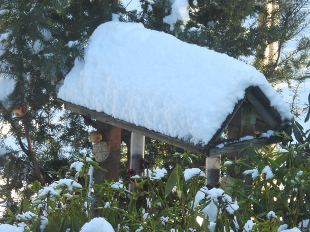 The rest of the birds have to find what food they can under the shelter of the eaves or the roof of a feeding station. I think they have a hard time in the snow, especially when the sun comes out and thaws huge portions that slide off branches, and threaten to bury them in the avalanche.
