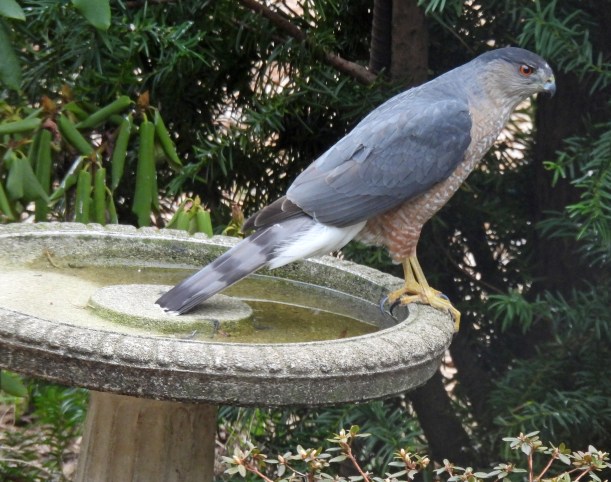 The songbirds always let it be known when there’s a killer in their midst, be it a cat, a raccoon, a hawk, or a crow. Today, it seems that every bird in my little acre was shrieking with alarm — not just the usual robin whose nest was threatened, but the chickadees, nuthatches, and many others as well. When all the birds sing happy songs, it’s background music, but when they sound like several fire alarms going off, something is wrong. I went out onto the deck to have a look.