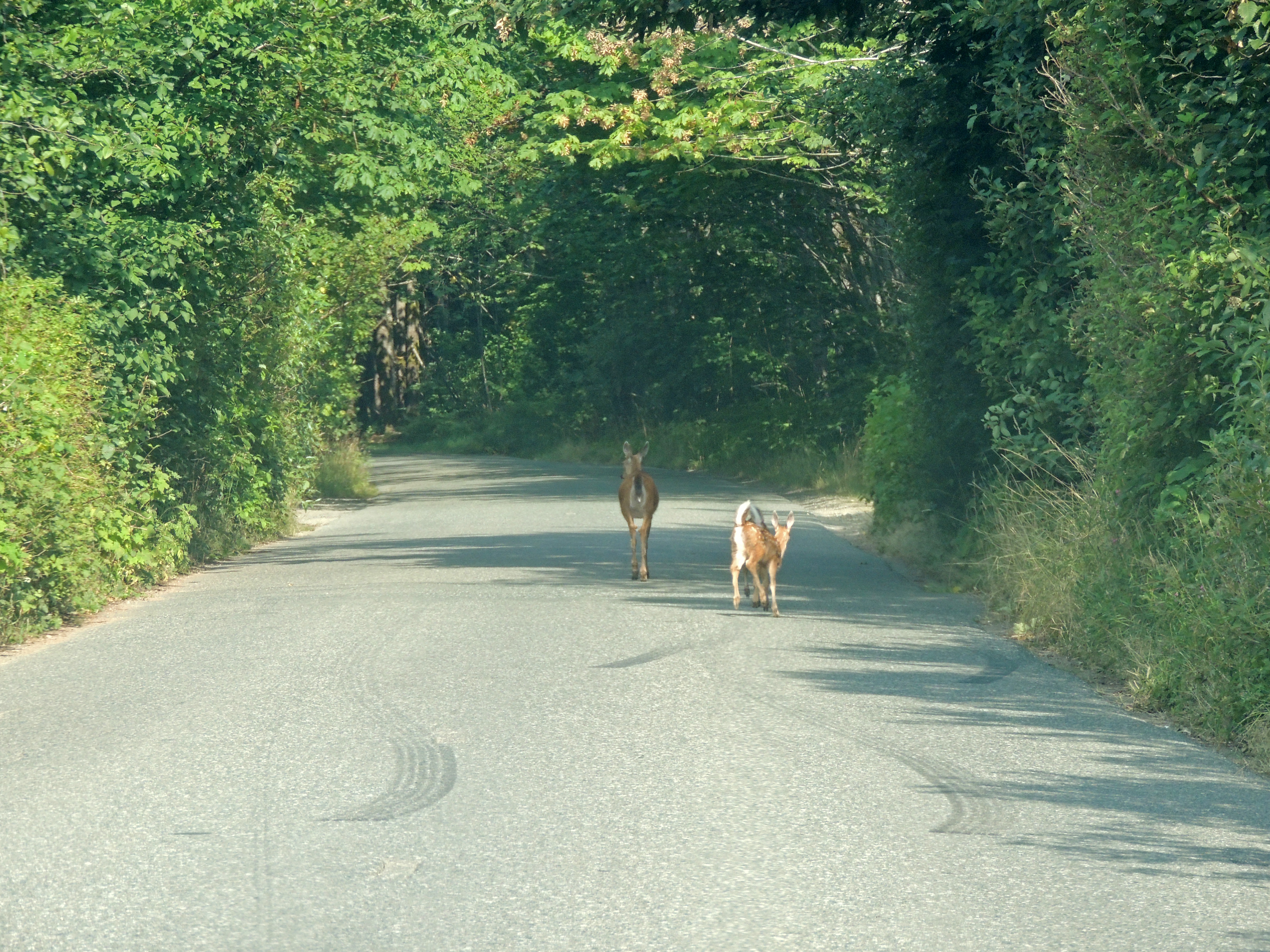 On this rural road, I came upon a doe and two fawns. Yes, there is a second fawn in front of the one that is obvious. I had to count legs. Either there were two fawns, or one fawn had more than four legs.