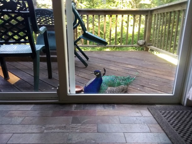 While visiting friends, we were surprised to see this peacock at their door. He lives in their neighbourhood and sometimes our friends put food out for him, so he comes to visit once in a while. I asked my friend to snap a quick picture with his phone, and here we have it.