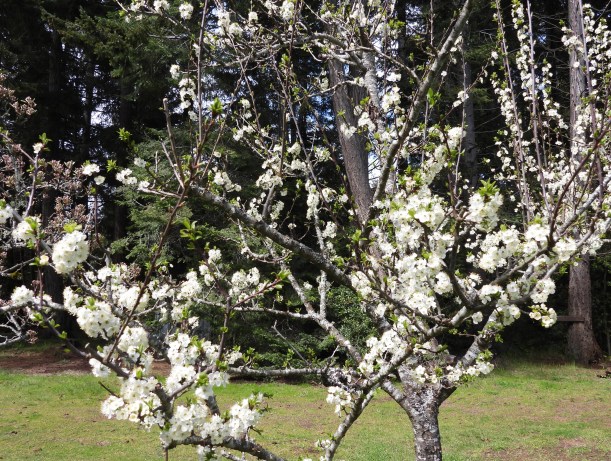 It was a day of surprises. Yesterday, this plum tree had only tightly bunched up buds. Today the sun came out for a few minutes and the plum tree called out,